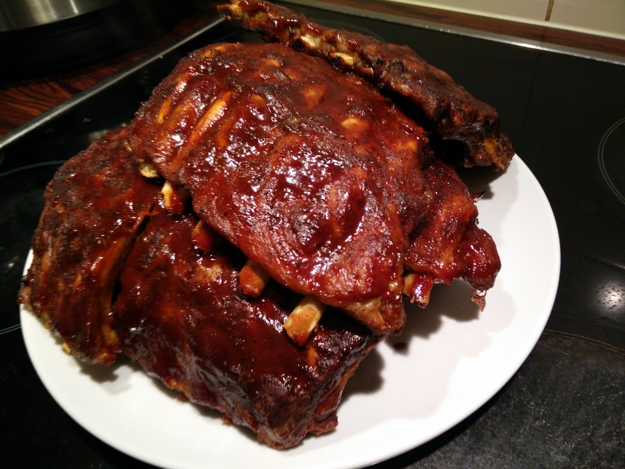 • Once pressure has dropped, carefully open the lid and move ribs to a baking tray, brush with as much BBQ sauce as you want, all sides, even bones
