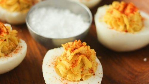 - Cut in half, remove the yolks and set them aside into a bowl.